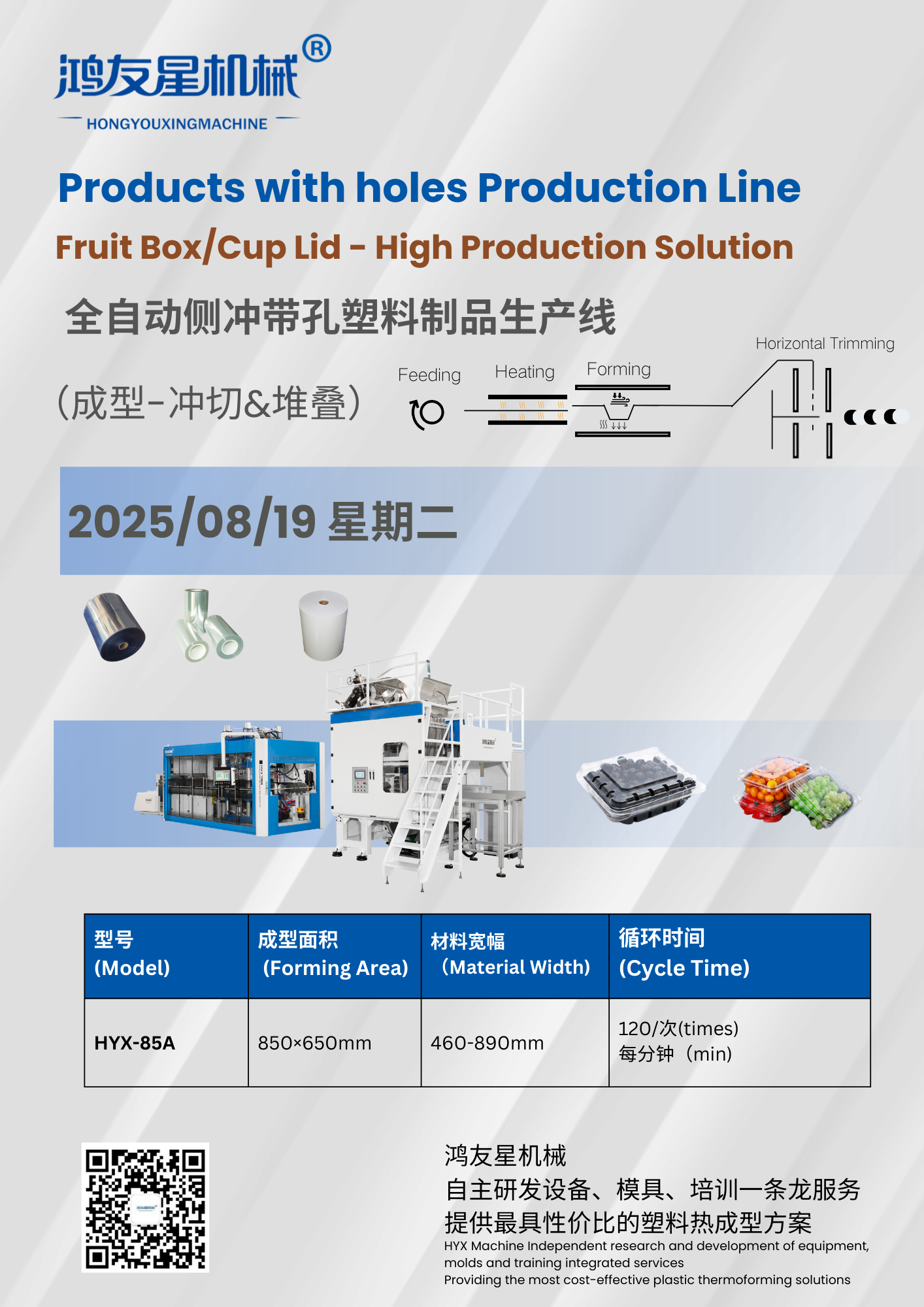 Подходит для изготовления крышек для чашек, коробочек для клубники и блистерных коробок с боковыми и нижними отверстиями. машины для формирования блистеров (также известные как блистерные машины/машины для испытания на перфорацию) представляют собой высокоавтоматизированное оборудование, способное удовлетворить сложные требования к упаковке и особенно широко используемое в пищевой упаковочной промышленности. Эти машины не только поддерживают традиционное формование блистеров, но также точно создают различные положения отверстий, например, боковые и нижние, для удовлетворения разнообразных функциональных требований к упаковке.